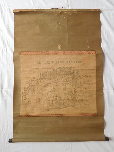 - 【版画】掛け軸 縣社猿賀神社真景之図 猿賀大神 神社 紙本 木版 希少