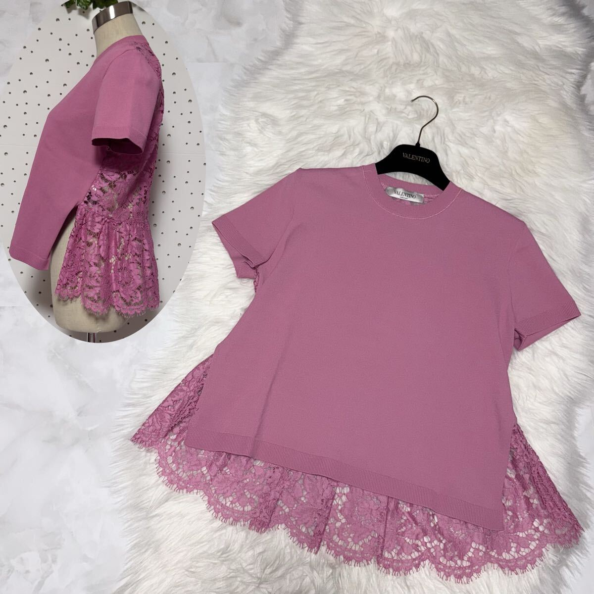 > 本物 ヴァレンティノ 花柄 フラワー レース 切替 フリル 半袖 ニット セーター カットソー トップス S ピンク VALENTINO バレンチノ