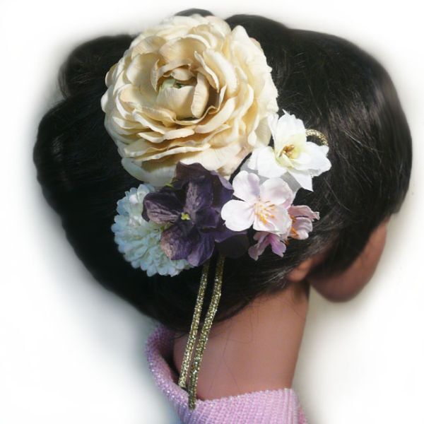 - 髪飾り 成人式 花 金鳳花beとデルフィ菊桜 ベージュ 結婚式 卒業式 振袖 袴 和装 かんざし くすみ系