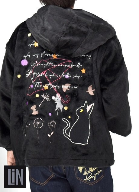 - ラミ&アール 雨やんだ後の晴れた午後総刺繍ボアパーカー◆LIN ブラック Lサイズ AL-75752 黒猫 ネコ 鼠 ユニセックス
