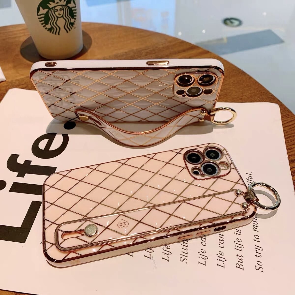 > 新品 アイホン ケース スマホ iPhone 13pro 13プロ 落下防止ベルト 高級感 アイフォーン ピンク 光沢 格子柄 マトラッセ