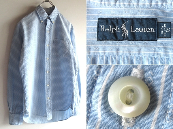 > 希少 00sビンテージ Ralph Lauren ラルフローレン 貝釦 コットン ジャガードストライプ BDシャツ S ライトブルー インパクト21 ネコポス可