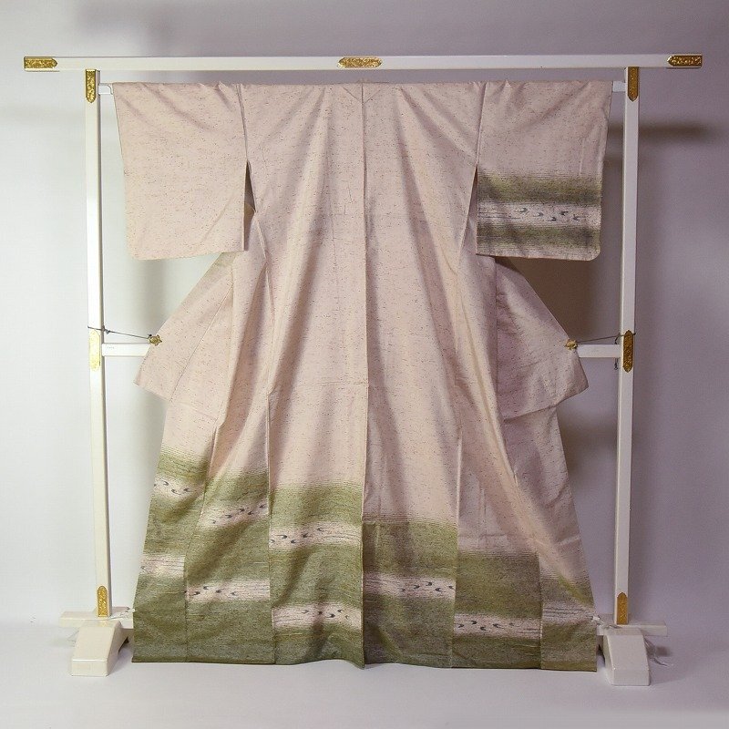 > 【ほりだし堂】 お仕立て済み 正絹 ぜんまい紬(袷) 琉球かすり模様/生成り、薄緑 着物 身丈158.5cm
