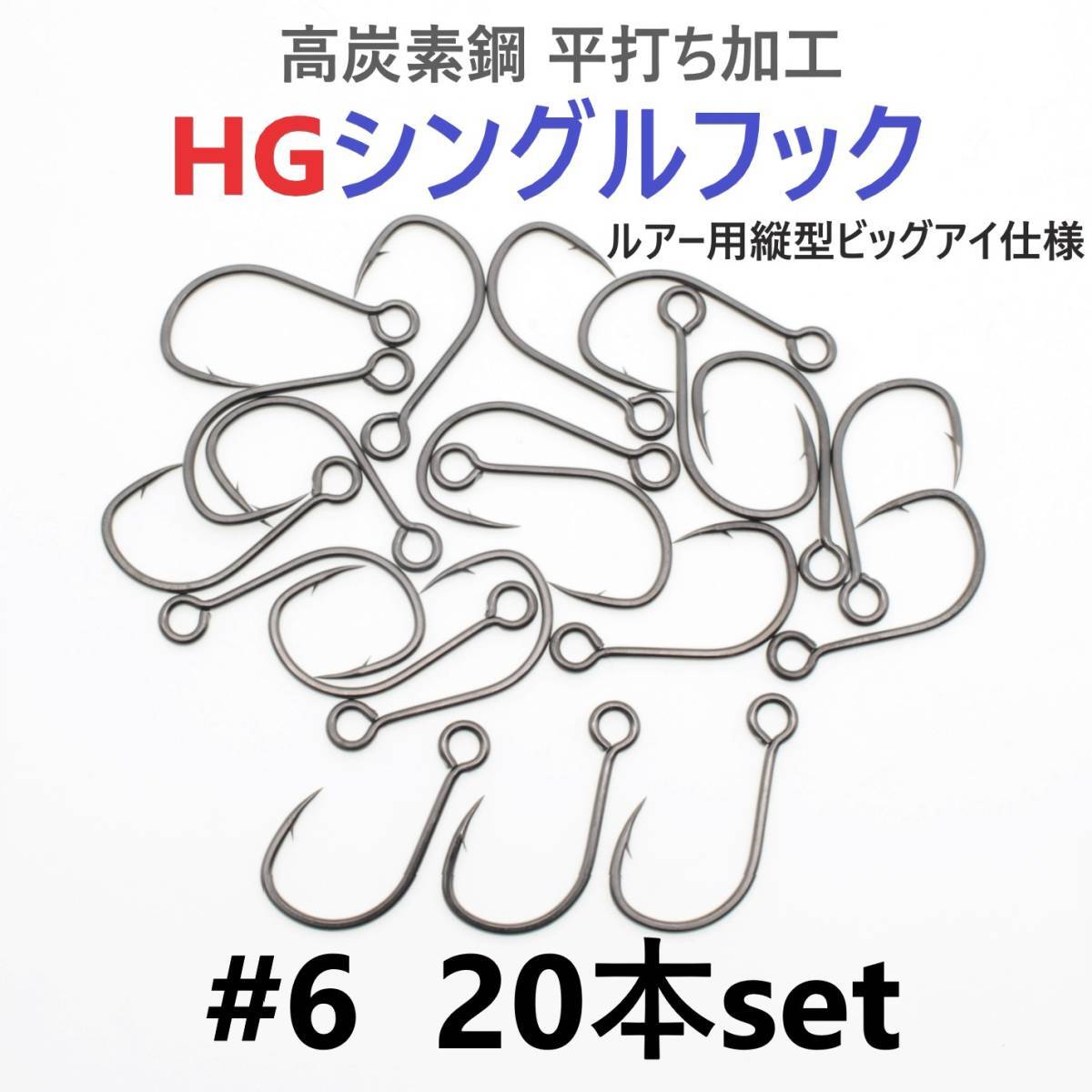 > 【送料150円】高炭素鋼 平打ち加工 ハイグレードシングルフック #6 20本セット ソルト対応 ブラックニッケルメッキ 縦アイ ビッグアイ仕様