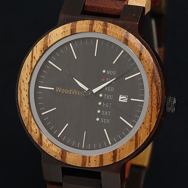 - 稼働 良品 QZ ウッドウェルト デイデイト 木製腕時計 黒文字盤 メンズ腕時計 OKZ 2000000