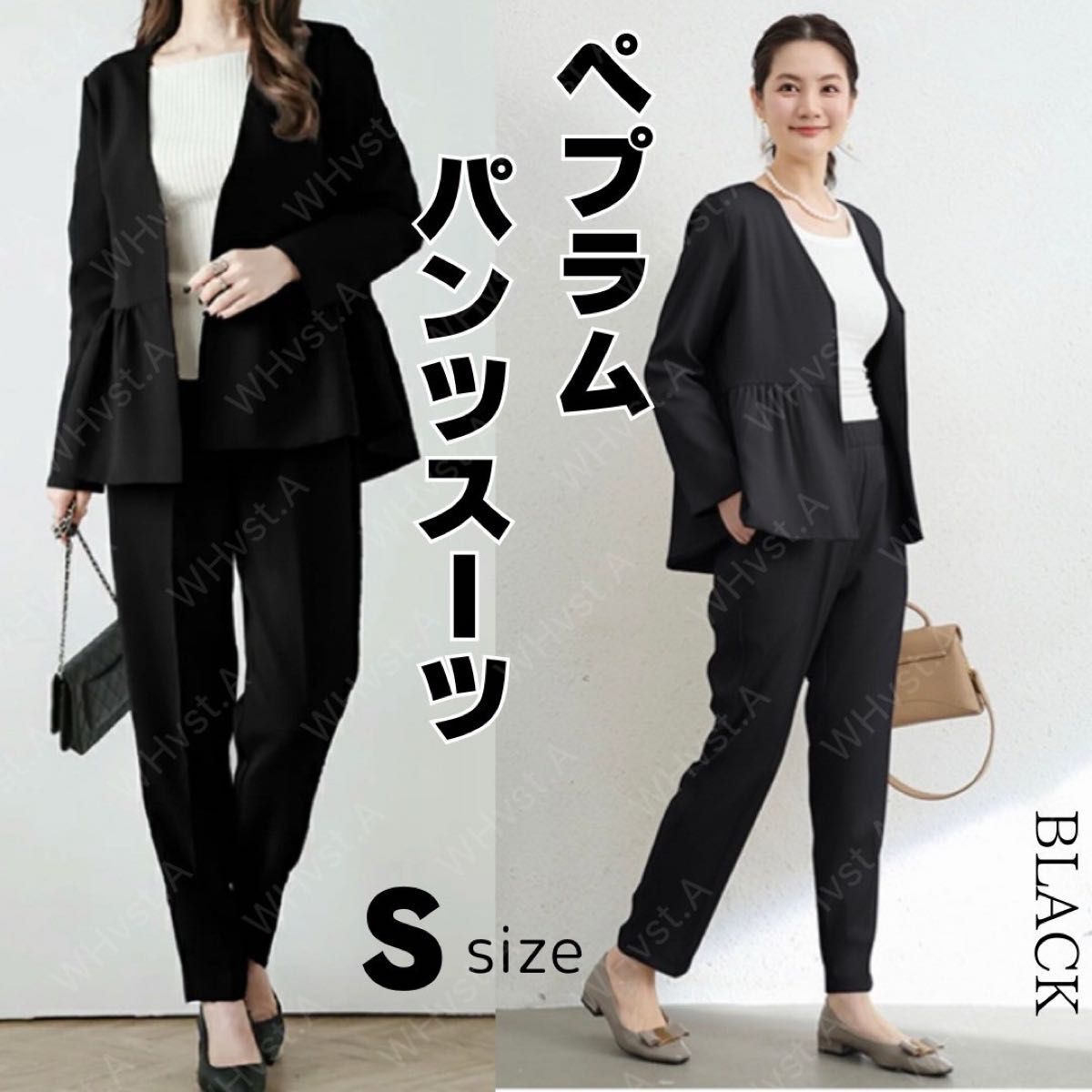 - ペプラム パンツセットアップ フォーマル スーツ フリル 大人可 体型カバー ブラック S