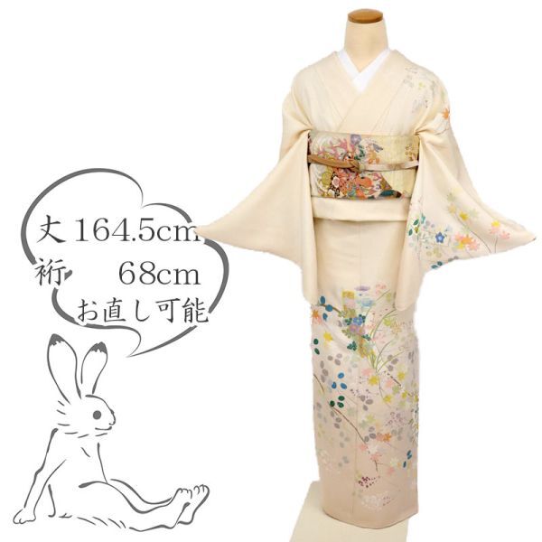> 【訪問着】 長尺 シンプル 短冊に四季花植物 クリーム色 袷正絹着物 HY2-5