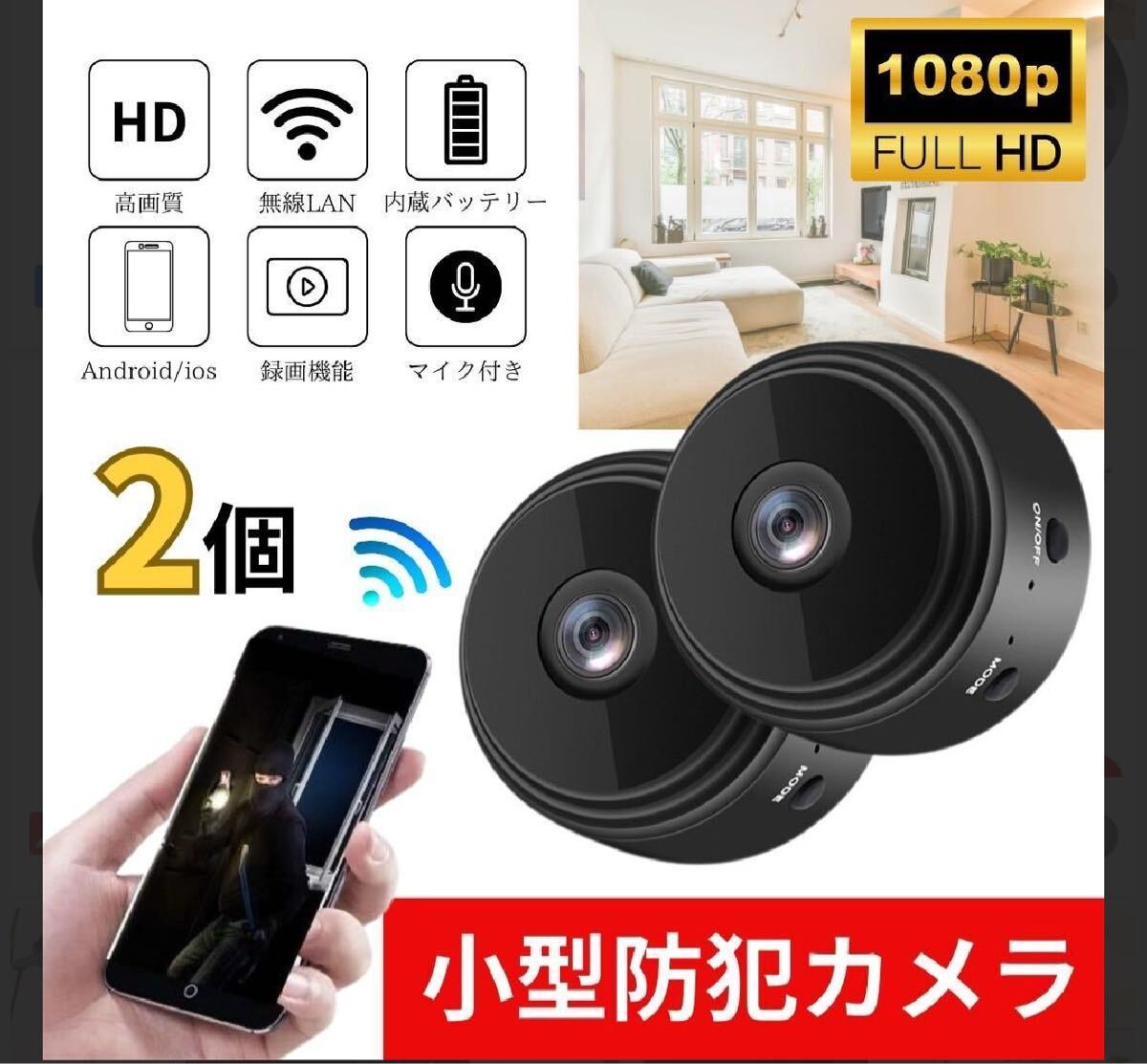 - 小型防犯カメラ2個1080P wifi 監視カメラ 150度広角 暗視 遠隔
