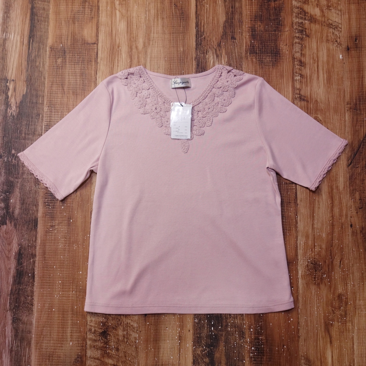 - 未使用 Sanpigalle レースネック 半袖カットソー レディース フラワーモチーフ 上品 フェミニン Mサイズ くすみピンク PW3
