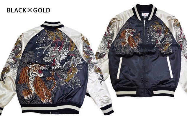 - 龍虎サテンスカジャン◆華鳥風月 ブラック×ゴールドXXLサイズ 3051801 和柄 和風 刺繍 竜 トラ スーベニアジャケット