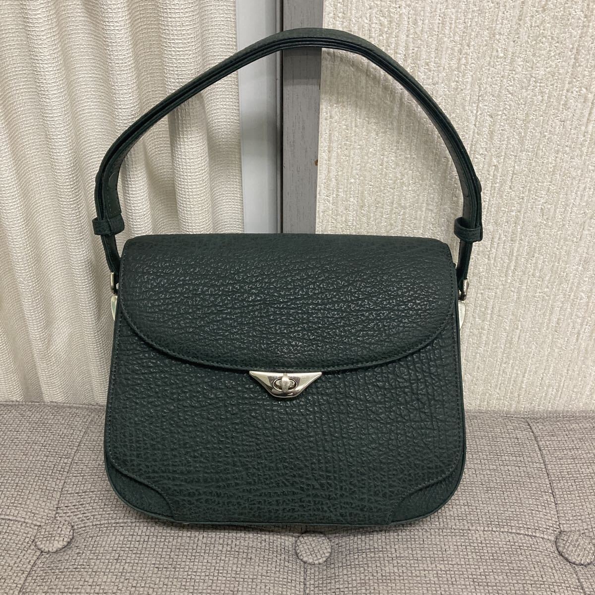 - シャークスキン 2way ハンドバッグ ショルダーバッグ ダークグリーン シルバー金具