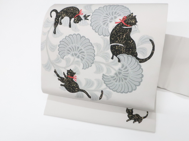 - 《古美術京松》リサイクル着物 オリジナル 九寸名古屋帯 お太鼓柄 猫に花 ネコ 金彩 正絹 sok7b09-47