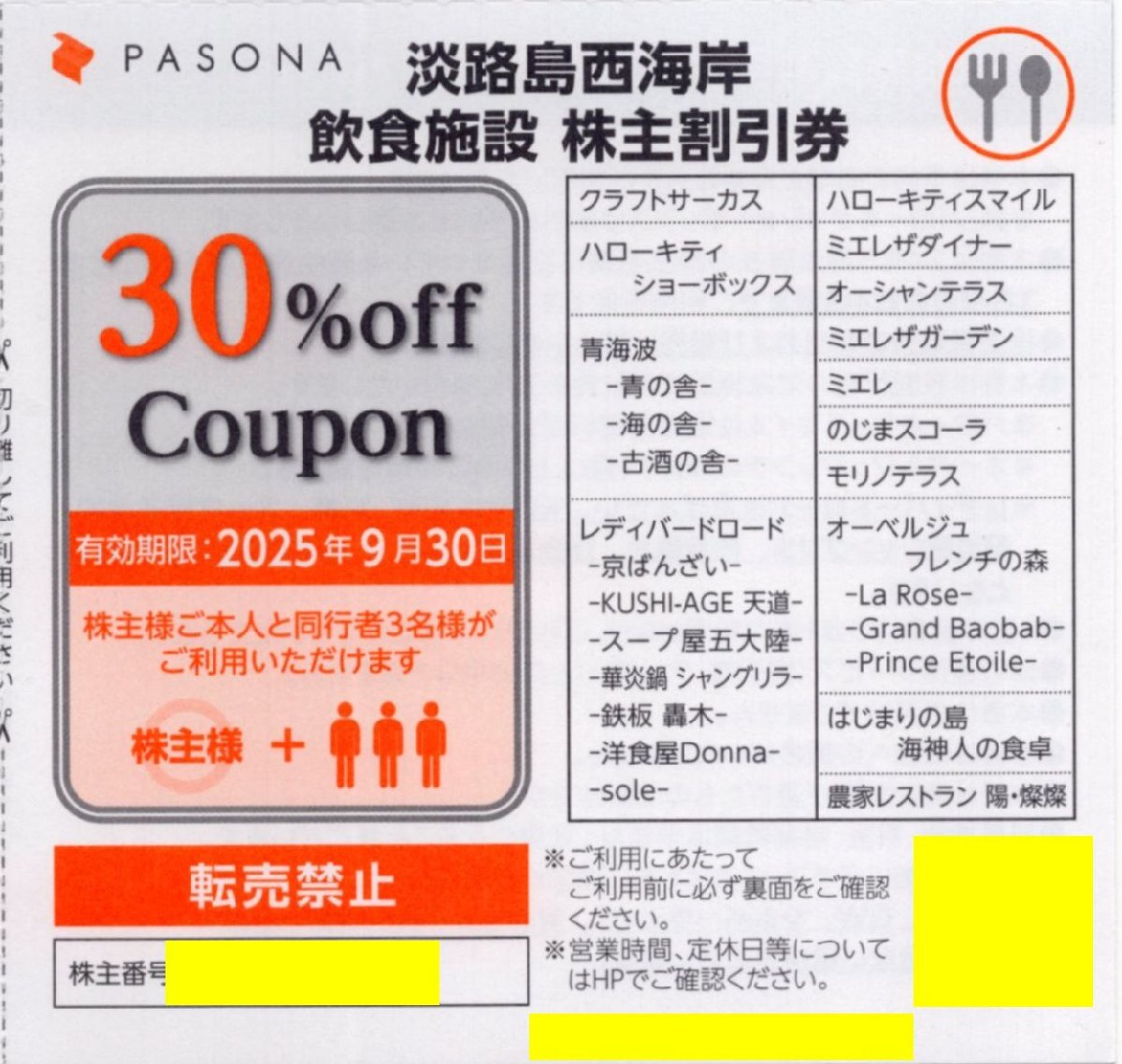 [商品内容]・パソナグループの株主優待 淡路島西海岸飲食施設30%OFFクーポンです。