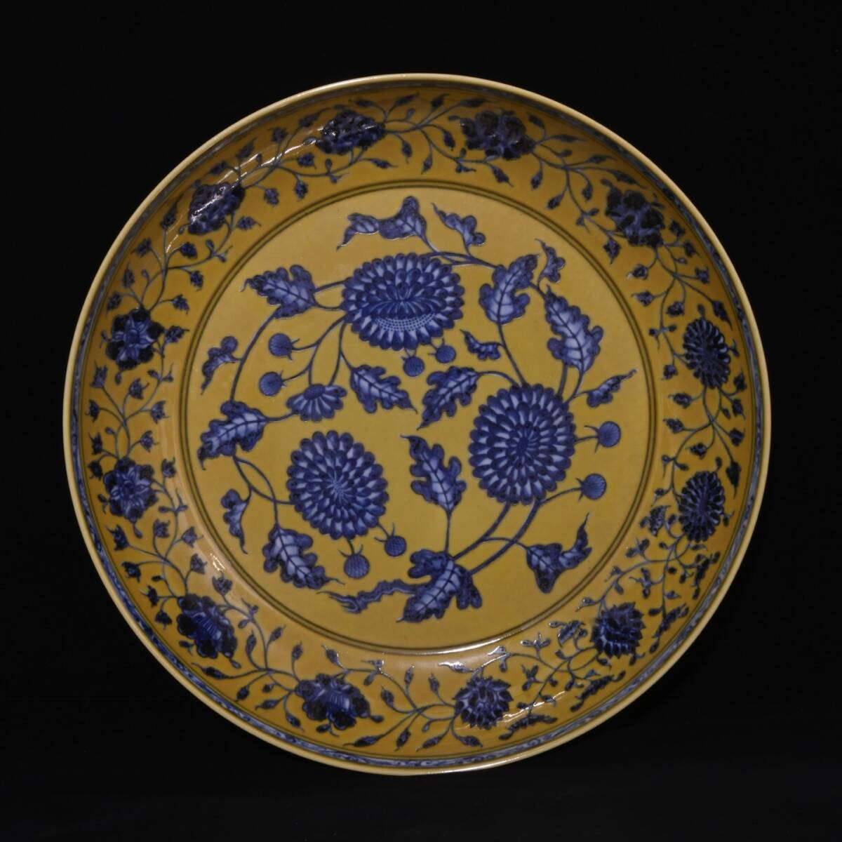 - 9+GV9192「東洋美術」 中国骨董 人間国宝 磁器製品【乾隆帝の銘が刻まれた黄釉青白花文皿】 旧物 孤品 珍品 陶磁器 収蔵価値が高い