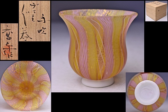 > 藤田喬平 ★ 手吹硝子 ヴェニス ぐい呑 ★ 共箱 栞 ★ レース文様のピンクと黄色 そして金彩が美しい逸品 ★ ガラス盃 ★ 検 藤田潤