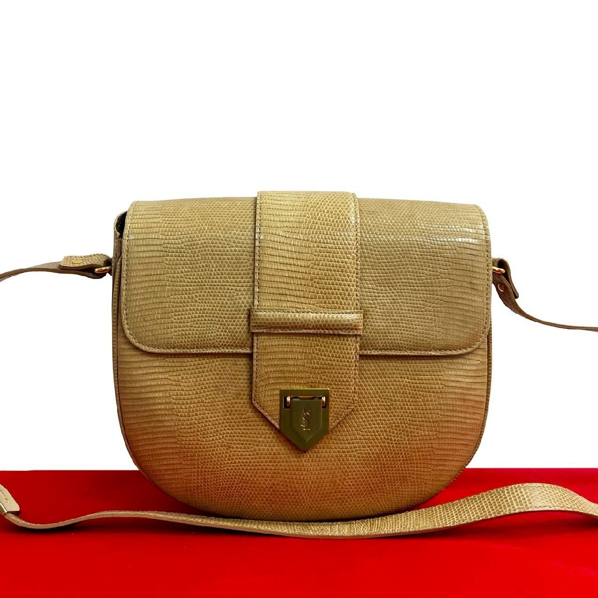 - 極 美品 YVES SAINT LAURENT イヴ・サンローラン YSL ロゴ 金具 リザード レザー ミニ ショルダーバッグ ポシェット ベージュ 35245