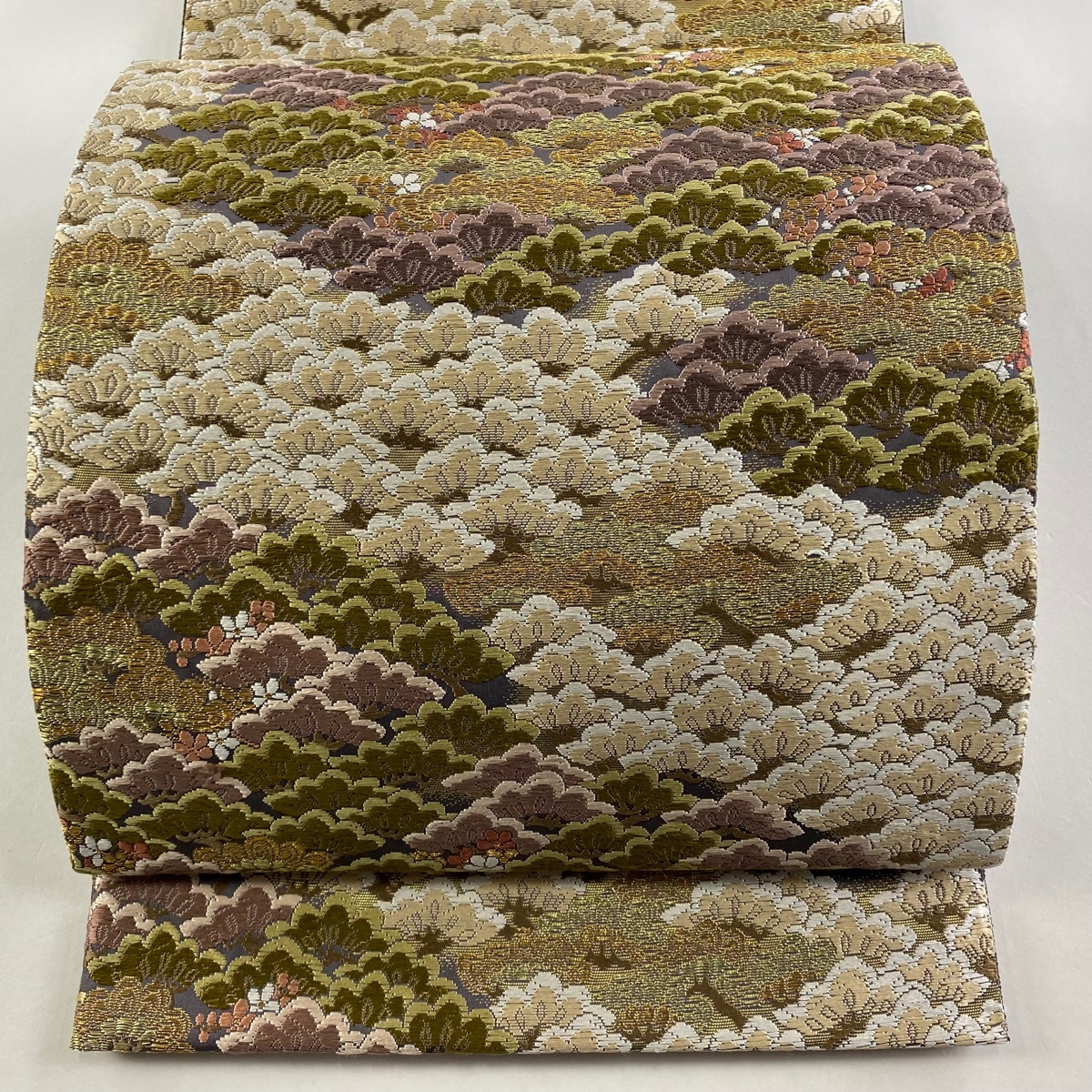 - 袋帯 名品 笠松 梅 金糸 箔 茶緑色 六通 正絹 【中古】