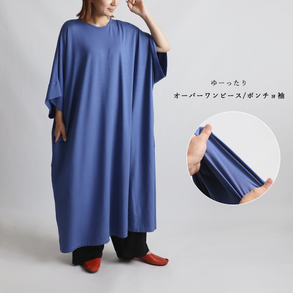 > 秋支度SALE 120cm とろみ伸縮カットソー ゆったり ポンチョ袖 オーバーシャツ ワンピース ワイド ブルーパープル F61A