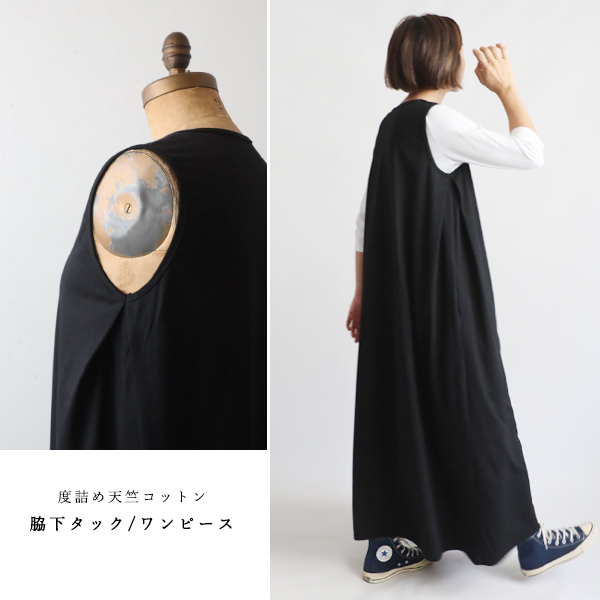 - 秋SALE 132cm 度詰め天竺コットン100%Tシャツ生地 脇下タック入 ロング ワンピース マキシ ブラック 黒 F07