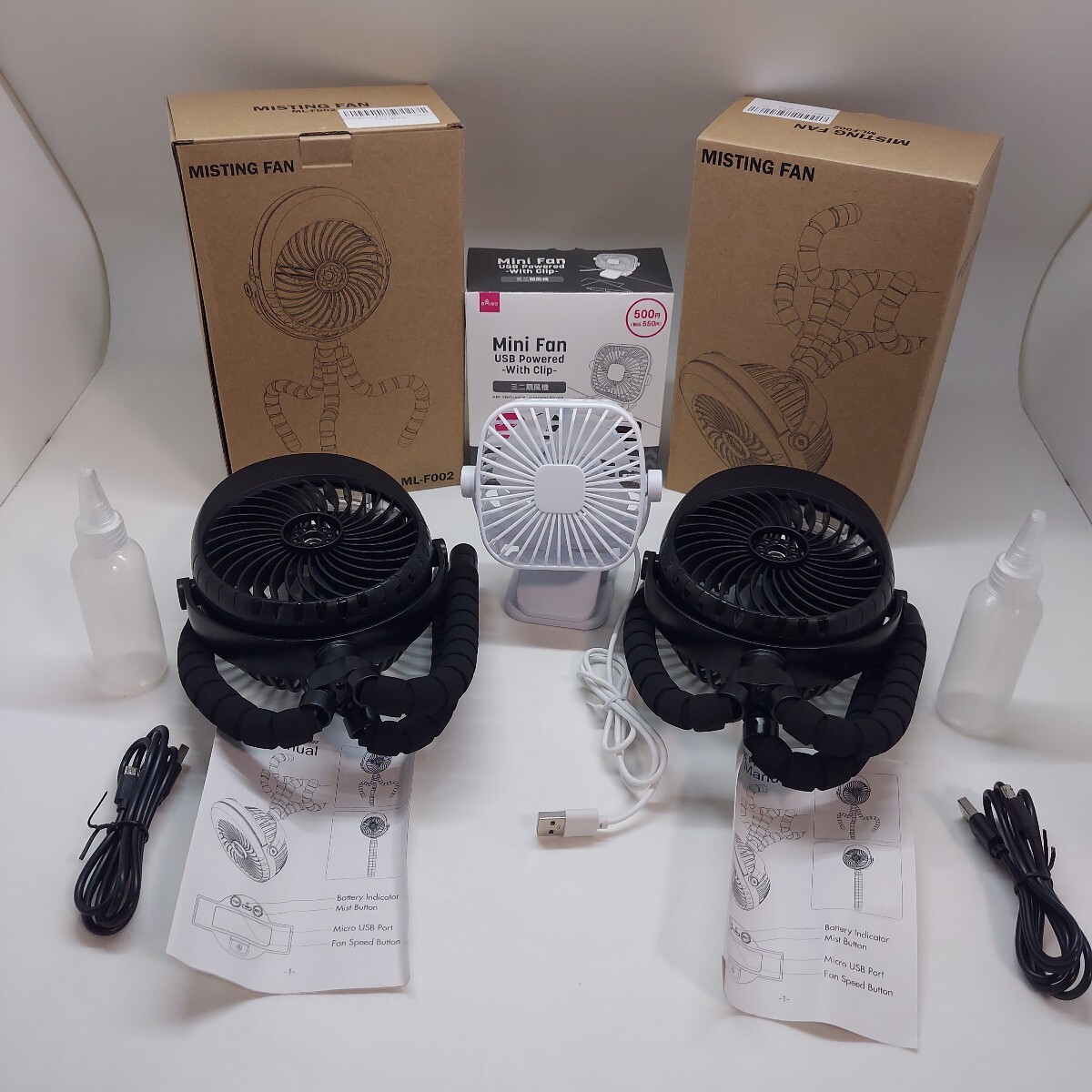 - くねくね巻付き自由自在 MISTING FAN ML-F002 黒 2台セット&クリップミニファン 白 3台まとめて ミストファン ハンディファン ベビーカー
