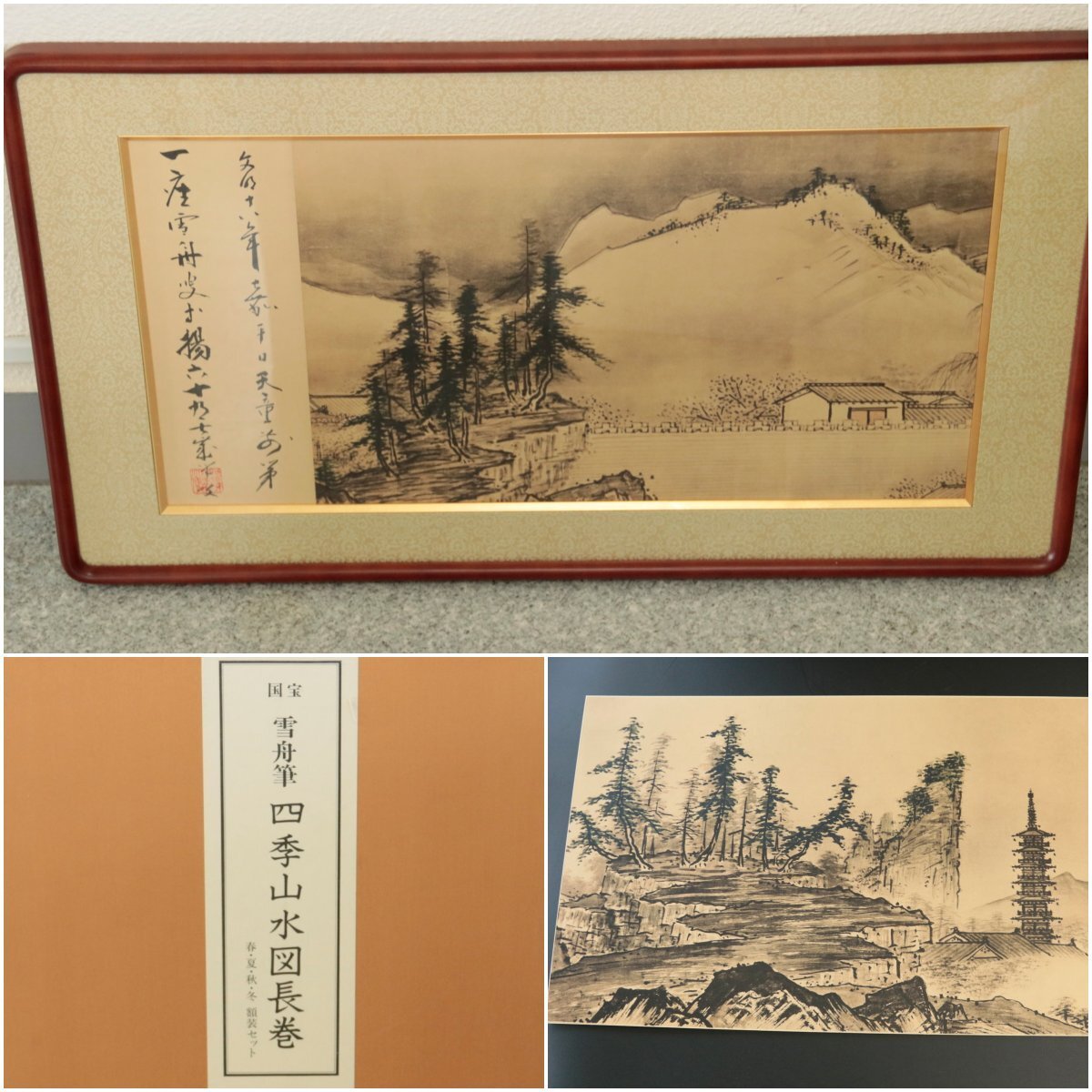 - 【巧芸/複製】『国宝 雪舟 筆 四季山水図長巻 春夏秋冬 額装セット』紙本額装 共箱 解説書付き ぎょうせい発行 書画 日本画 水墨画