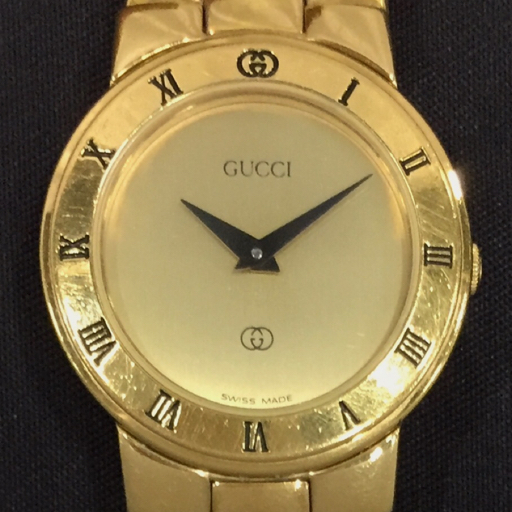 - グッチ 3300L クォーツ レディース 腕時計 ラウンドフェイス ゴールドカラー文字盤 純正ベルト 保存箱付き GUCCI