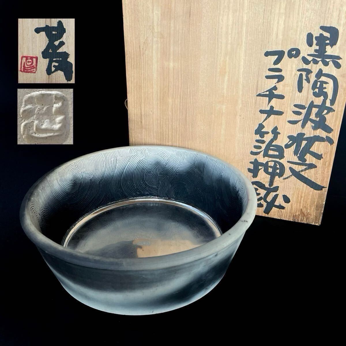 - 益子人気陶芸家 加守田章ニ門下 坂田甚内 秀逸作 黒陶波状文 プラチナ箔押鉢 共箱(1b080878 2)