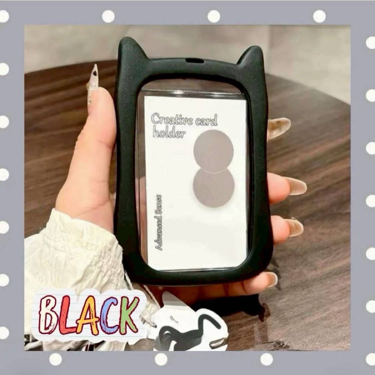 - 猫耳 トレカケース パスケース 定期入れ キーホルダー チェキ 推し活 ブラック