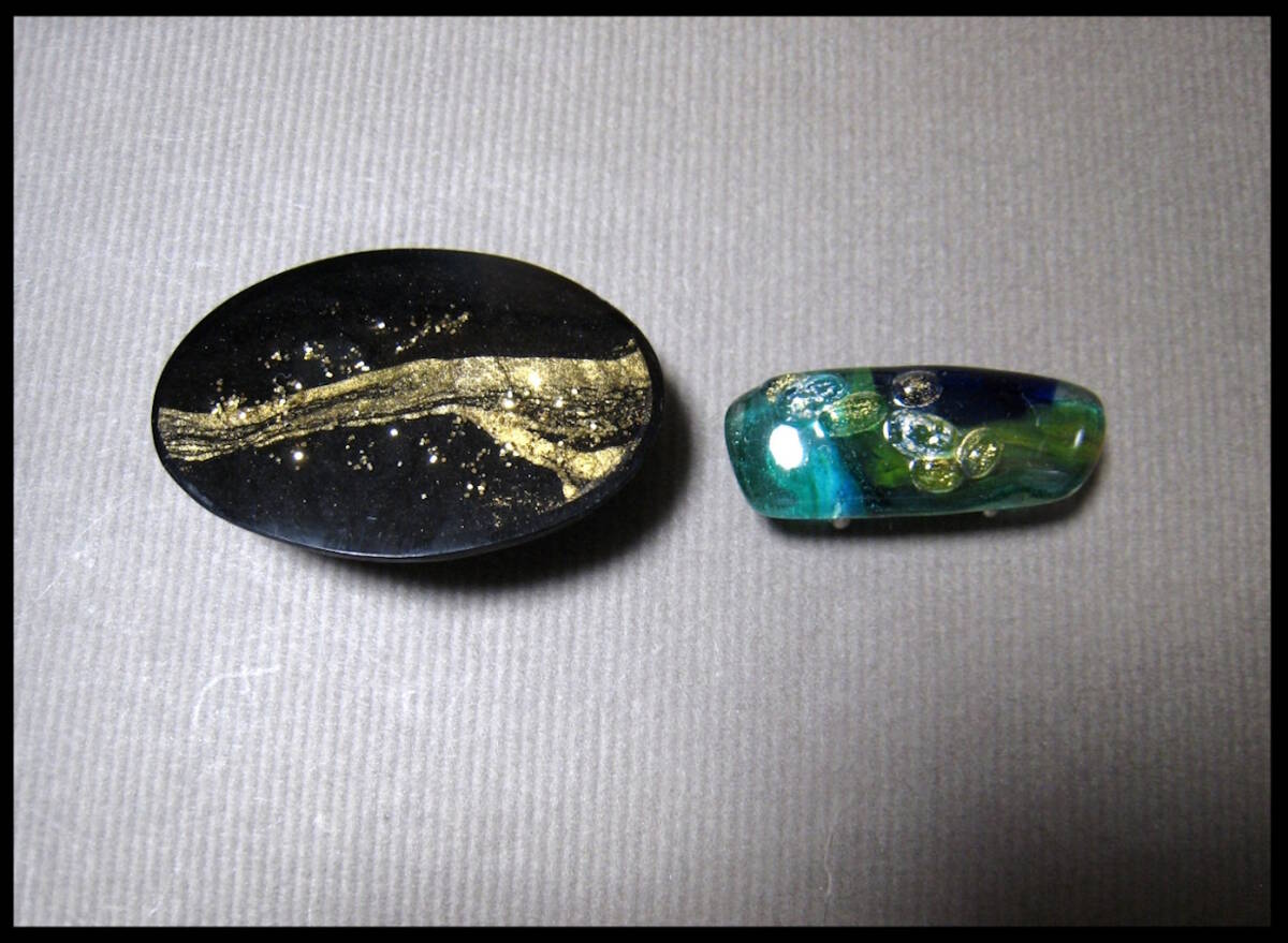 - ガラス 緑と瑠璃 黒色 金箔飾り ブローチ兼用 帯留 2点 着物 帯飾り 和装小物