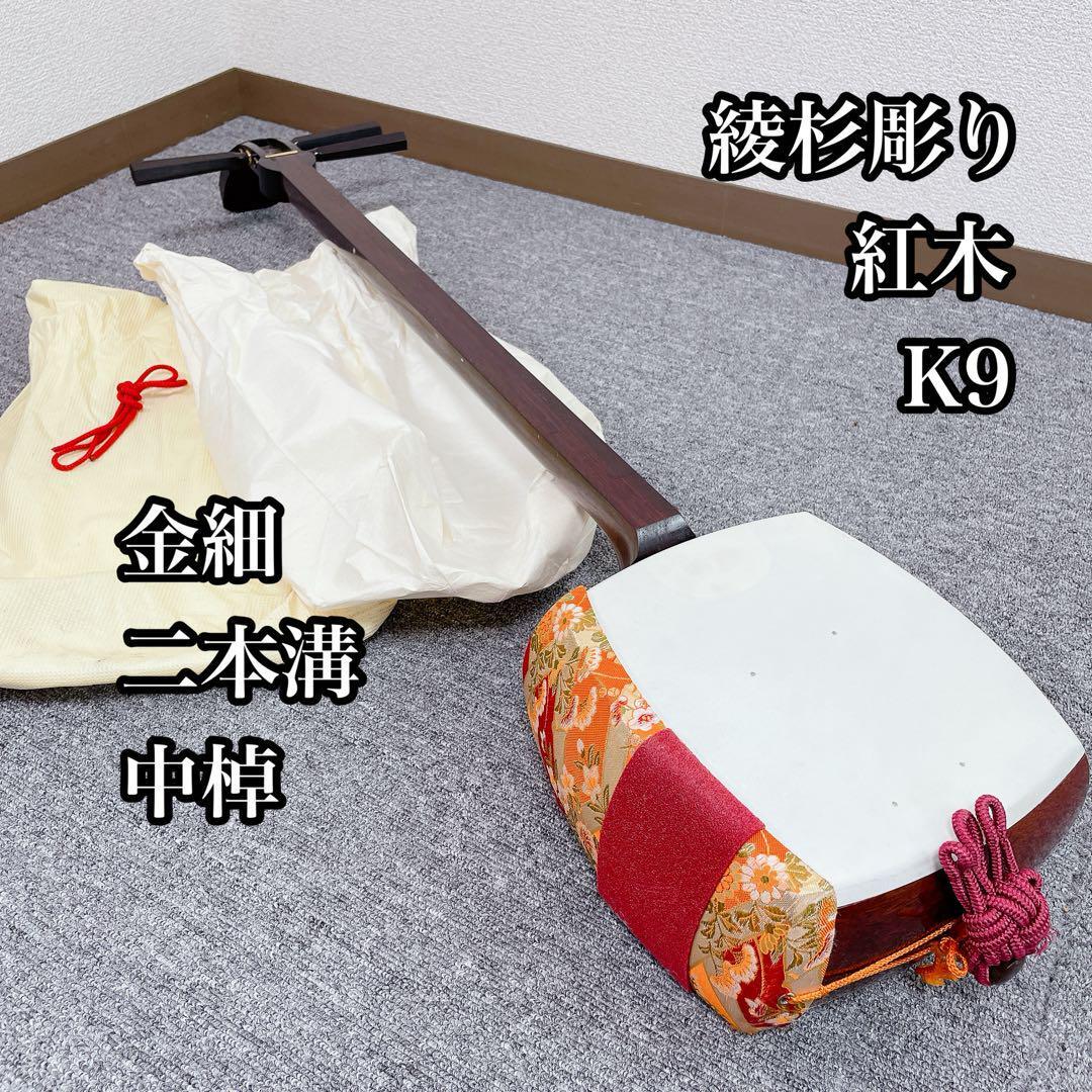 - 三味線 中棹 金細 K9 紅木 綾杉彫り 二本溝 和楽器
