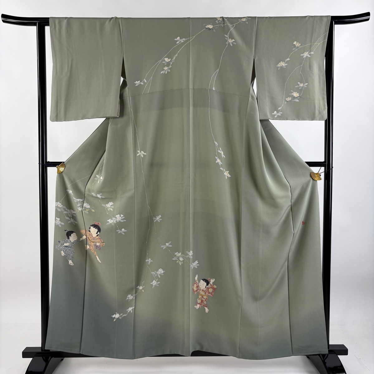 - 訪問着 身丈158.5cm 裄丈63.5cm S 袷 関口遼一 落款 童 枝花 ぼかし 灰緑 正絹 秀品 【中古】