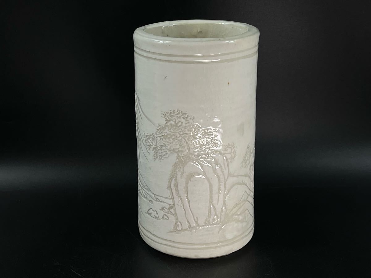 - 韓国美術 李朝 筆筒 白磁 陰刻雲龍紋 筆立 書道具 文房具【博圓】高16.3cm