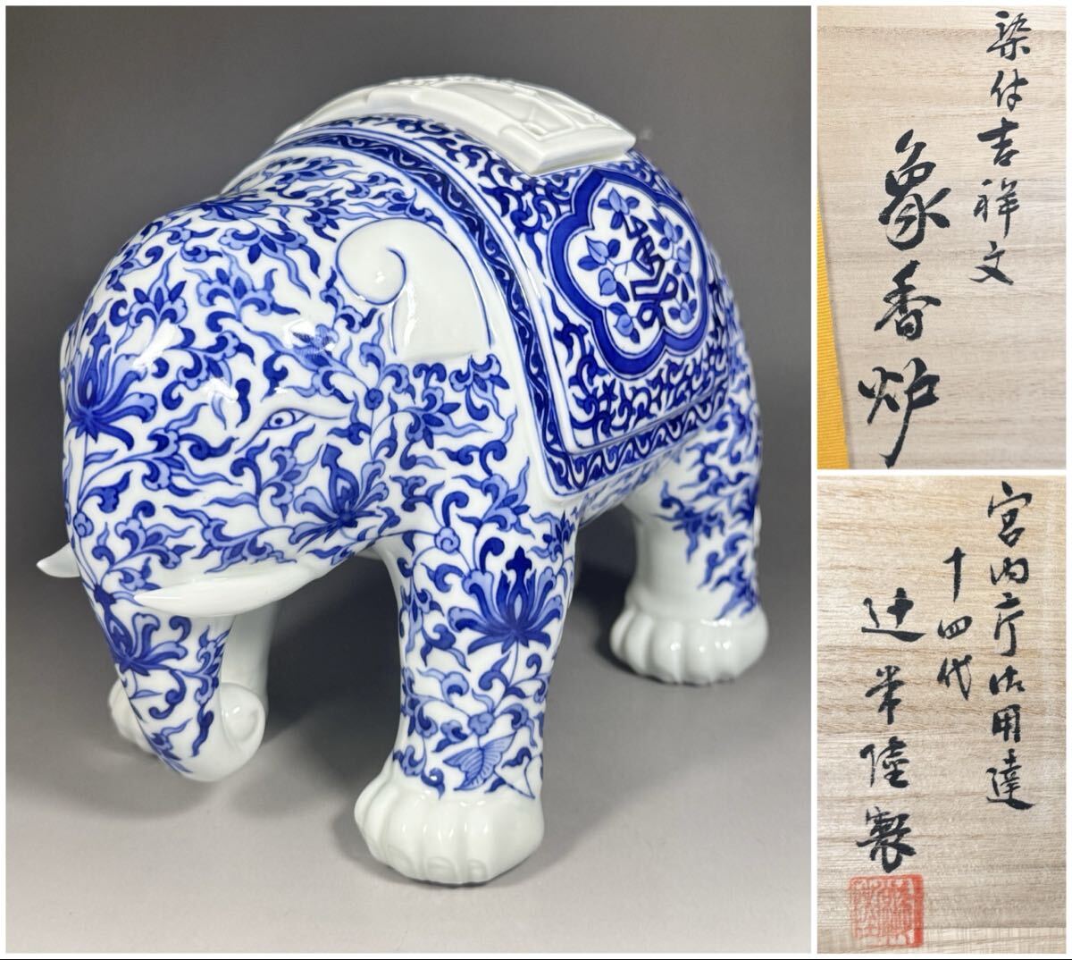 > 十四代 辻常陸 製 染付吉祥文 象 香炉 禁裏御用窯元 宮内庁御用達 染付 茶道具 共箱 栞 希少 秀逸作 美術品