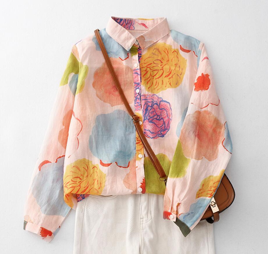 - 新入荷~トップス レディース 墨絵風プリント シャツ ブラウス 長袖 ゆったり 薄手 花柄 オフィス カジュアル きれいめ