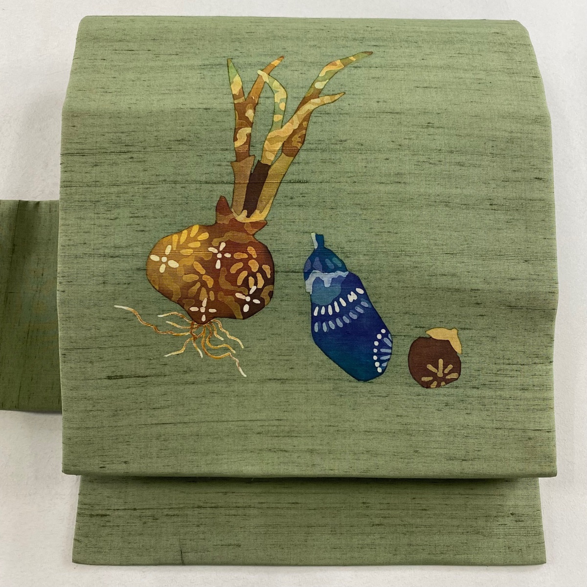 - 名古屋帯 美品 秀品 紬地 生り物 よもぎ色 正絹 【中古】