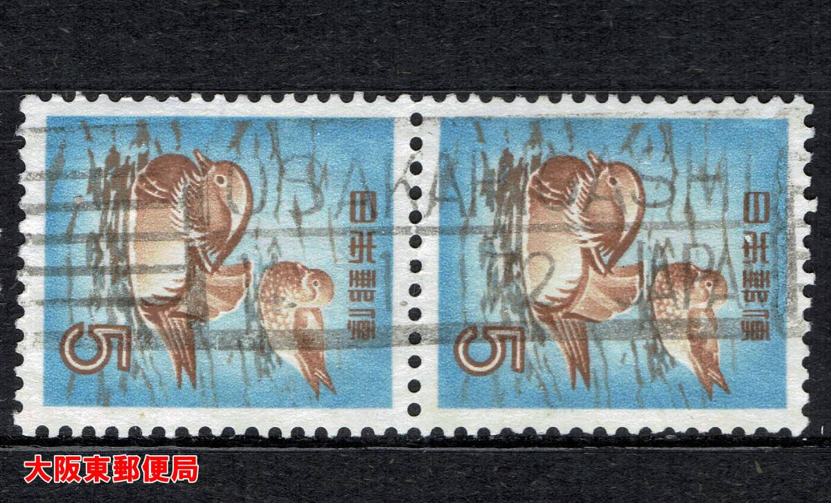 - 【使用済・普通切手の欧文印】オシドリ5円ペア(満月印)R