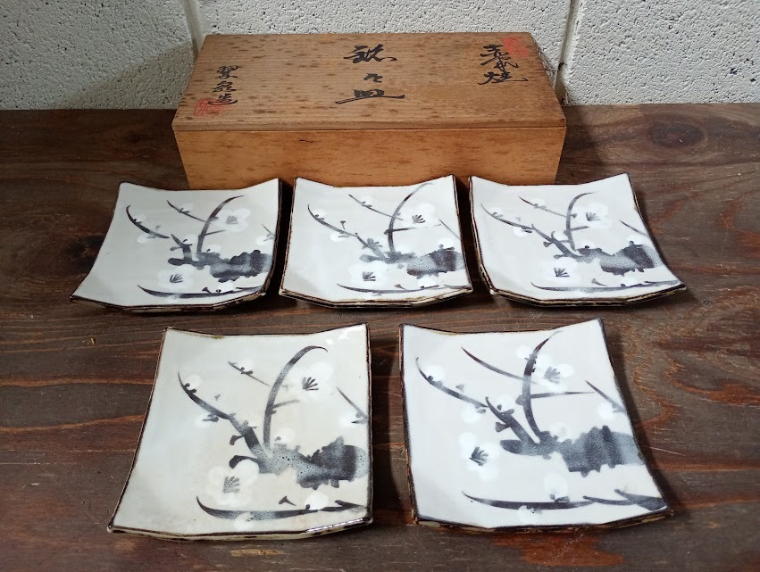 - ♪古皿セット/ 5点 翆泉造 赤津焼 銘々皿 菓子皿 茶道具 昭和レトロ 当時物 和食器 小皿 木箱