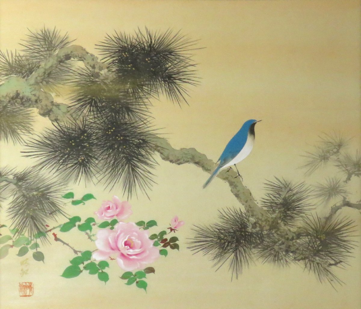 > ◆◇掛軸 寺田晴観 不老長春(老松に薔薇) 尺八横 hanging scroll◇◆早春 春 花鳥画 日本画 JY1883