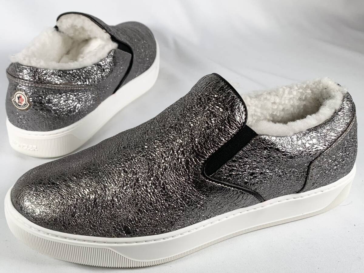 - 【正規品】極美品 モンクレール MONCLER ワッペンロゴ シルバーメタリック レザー ボア スリッポン スニーカー 靴 レディース シューズ 37