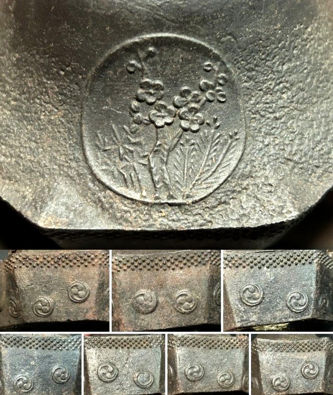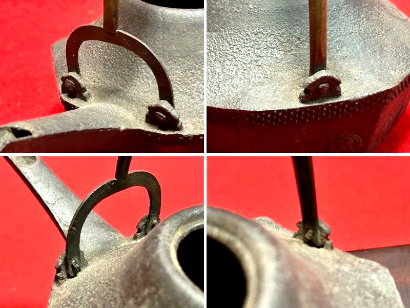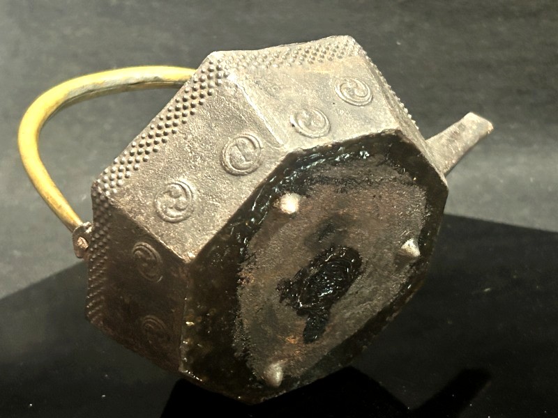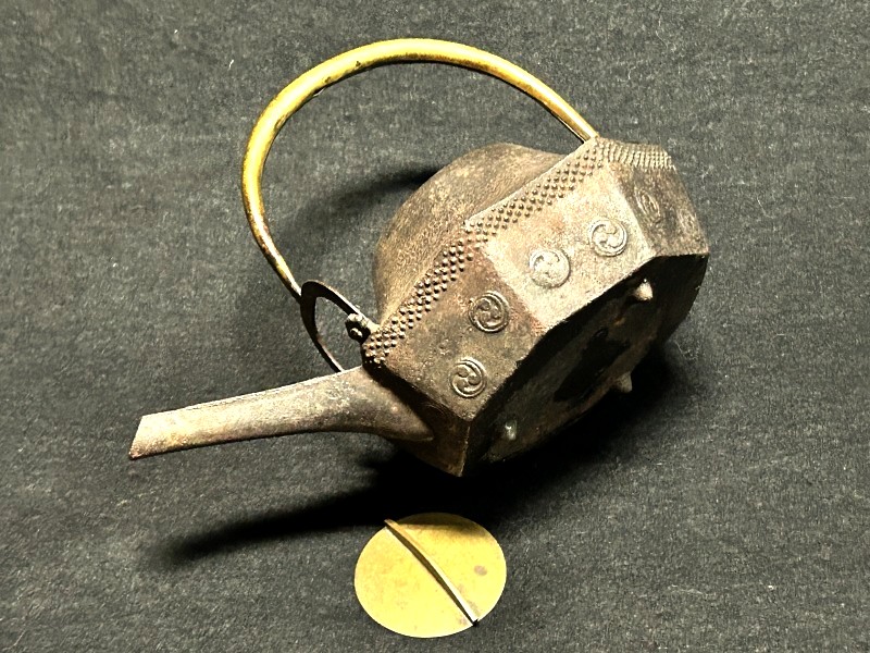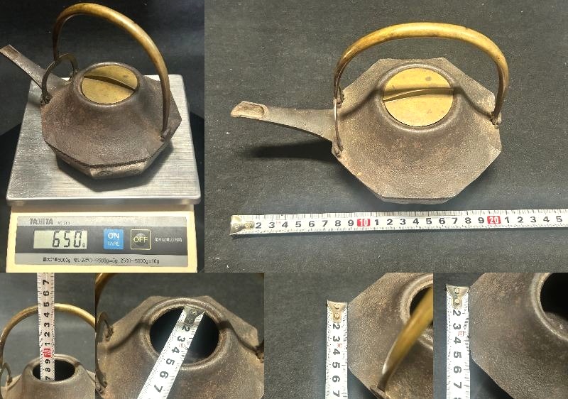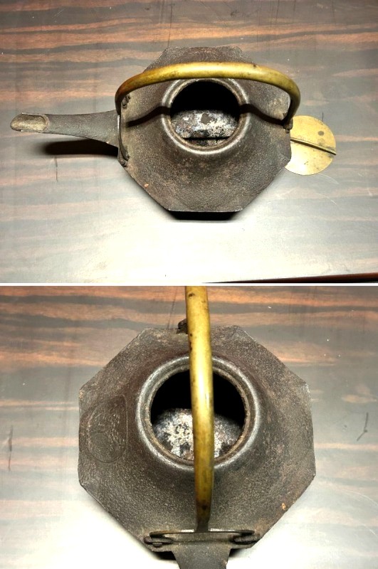 - ◇末広がり八角台座 鉄瓶銚子【 懐石道具/茶道具/湯沸/酒器【異素材 真鍮色の蓋 真鍮蓋 細身の注ぎ口 】Q09093