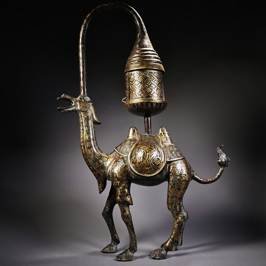 - ◆羽彰・古美術◆Y2616戦漢時代 青銅器 青銅錯金銘文駱駝宮灯 細密細工★古置物★古賞物★古擺件★蒐集家放出★唐物