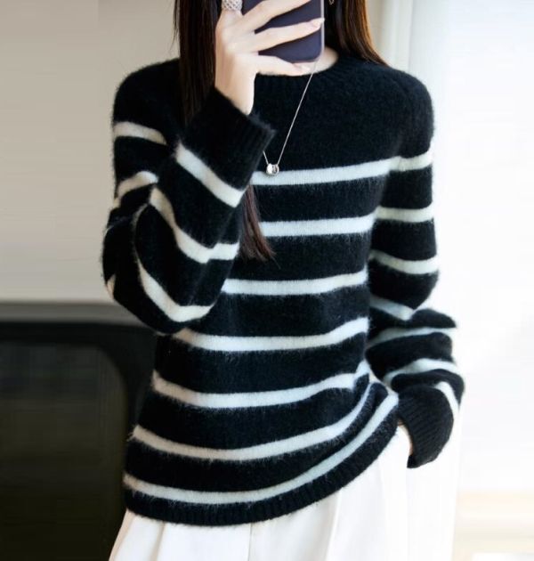 - 新入荷*高品質 配色 セーター ボーダー ストレッチ ニット トップス 長袖 おしゃれ 暖かい 防寒 オフィス 着やせ ニットセーター*ブラック
