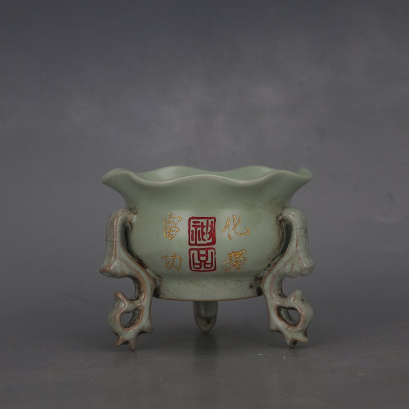 - 宋 汝窯 青釉 宋汝窯青釉 暗刻 宋徽宗款御題蓮の葉三足香炉 五大名窯鈞 鈞磁器 宋 賞皿置物 窯変釉 置物 鈞磁 盧鈞 装飾 磁器