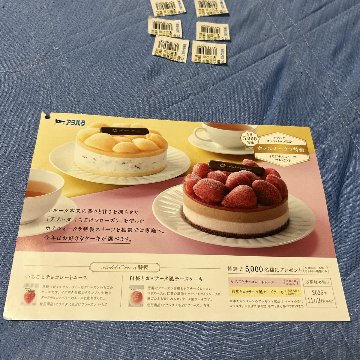 - アヲハタ バーコード12枚 ホテルオークラ特製オリジナルスイーツ応募券 いちごとチョコレートムース 白桃とカッサータ風チーズケーキ 懸賞