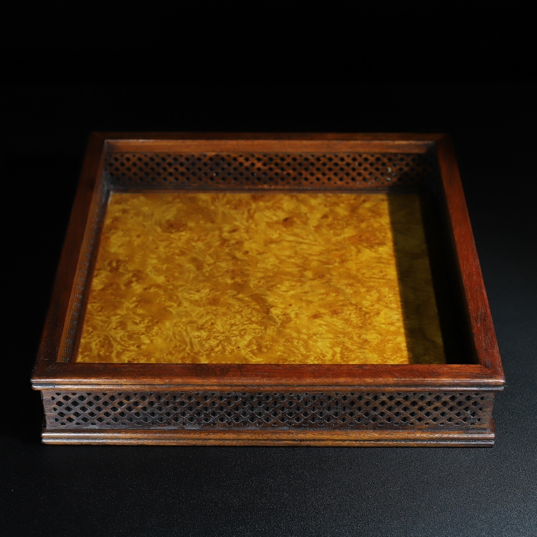 - 早期收集 古花梨木彫 空彫 四方 茶托 茶盤 托盤 收納盤 文案置物 擺件 時代物 骨董品 旧家蔵出し 唐物 中国古玩 古美術品