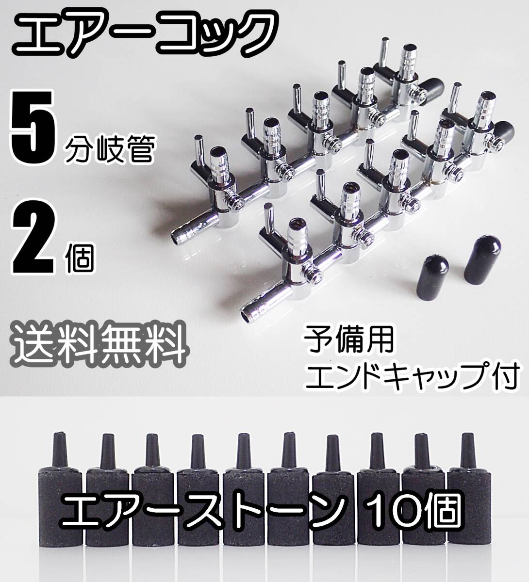 > 【送料込】エアーコック 5分岐管 2個 + エアーストーン(円柱黒)10個  シュリンプ・メダカ飼育時のエアー分岐・供給に 一方コック5連