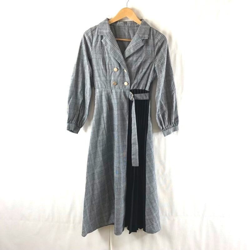 - グレイル GRL ワンピース ロング 長袖 グレンチェック柄 ダブルボタン プリーツ ベルト 綿 グレー系 Lサイズ 2025083000110