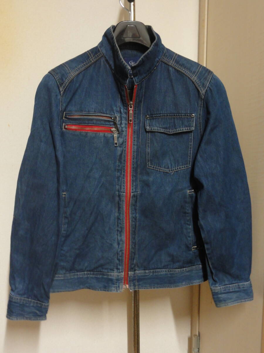 > 格安(胸囲112cm位)レア・G-STAGE JEANS(ジーステージ)・インディゴ系色ダメージ加工デニム地・高級ライダース系デザインブルゾン M