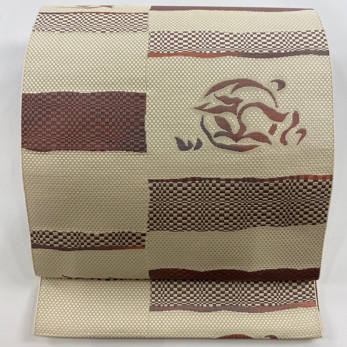- 名古屋帯 美品 秀品 八寸名古屋帯 市松 草花 ベージュ 正絹 【中古】