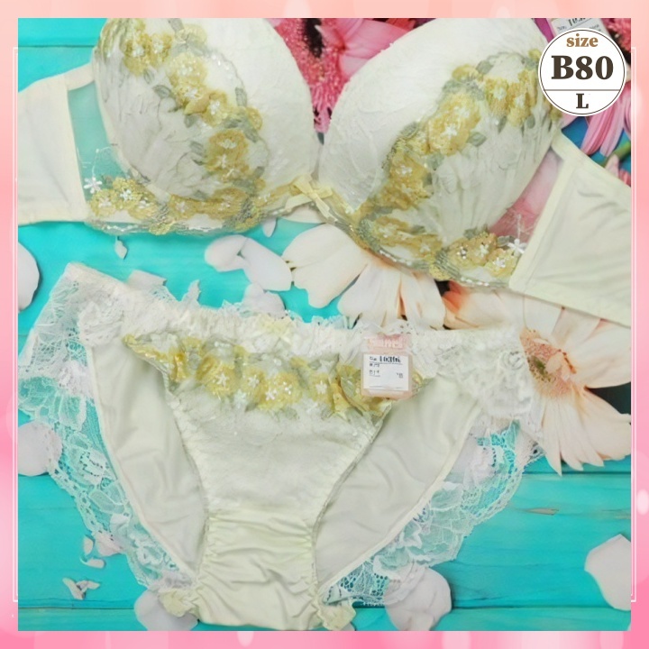 > Zb8063◎新品 ブラショーツセット【B80/L】下着 ランジェリー 脇高 美谷間 蒸れ軽減 穴あきカップ 朝顔畑 黄色